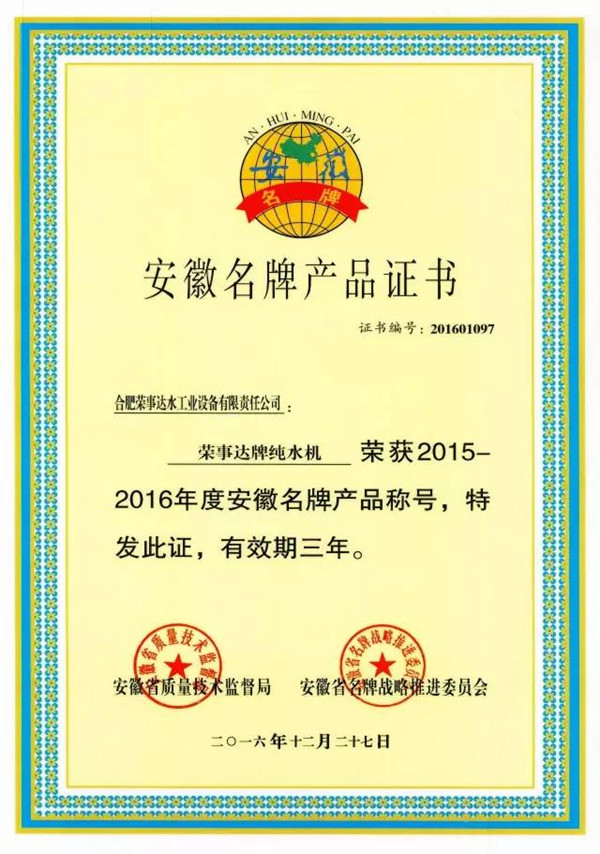日前,安徽省質(zhì)量技術(shù)監(jiān)督局、安徽省名牌戰(zhàn)略推進(jìn)委員會(huì)正式公示2015-2016年度安徽名牌產(chǎn)品榜單,合肥榮事達(dá)水工業(yè)設(shè)備有限責(zé)任公司申報(bào)的“榮事達(dá)牌純水機(jī)”產(chǎn)品榮列榜中,成為安徽凈水行業(yè)首家榮獲省級(jí)“名牌產(chǎn)品”稱號(hào)的企業(yè),榮事達(dá)水工業(yè)公司強(qiáng)勁實(shí)力再次獲得政府和社會(huì)的充分肯定。